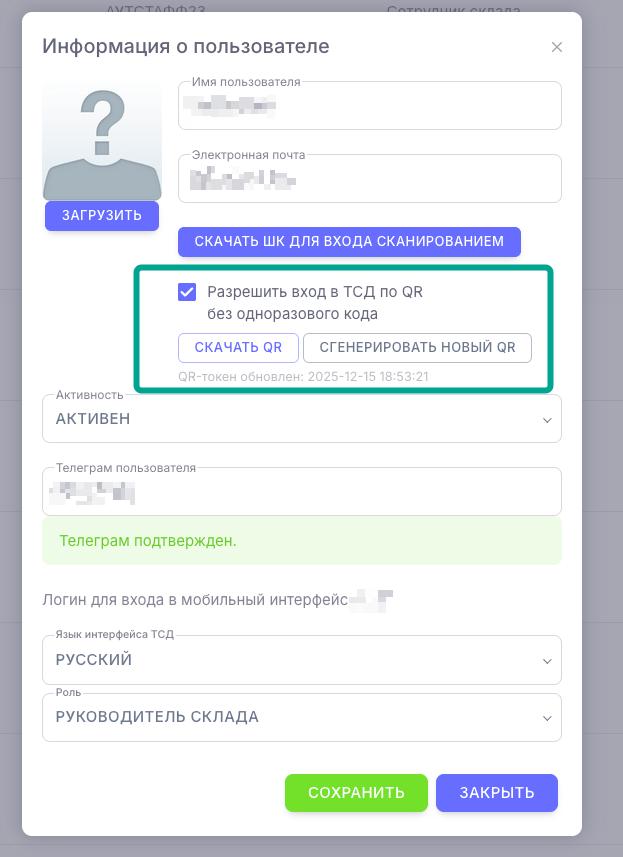 Активируйте функцию нажав на галочку "Разрешить вход в ТСД по QR без одноразового кода" и скачайте QR-код.